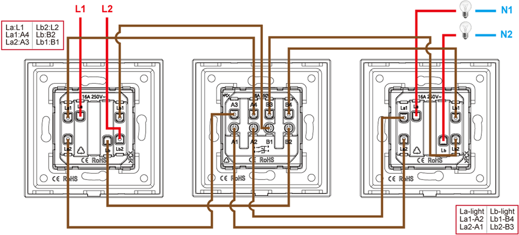Mechanický krížový vypínač č.5B slúži na ovládanie dvoch okruhov osvetlenia z troch miest. Vypínač je navrhnutý pre montáž do klasických inštalačných krabičiek a je plne kompatibilný s pôvodnou kabelážou. Samostatný modul vypínača sa používa v prípade inštalácie do viacrámiku.