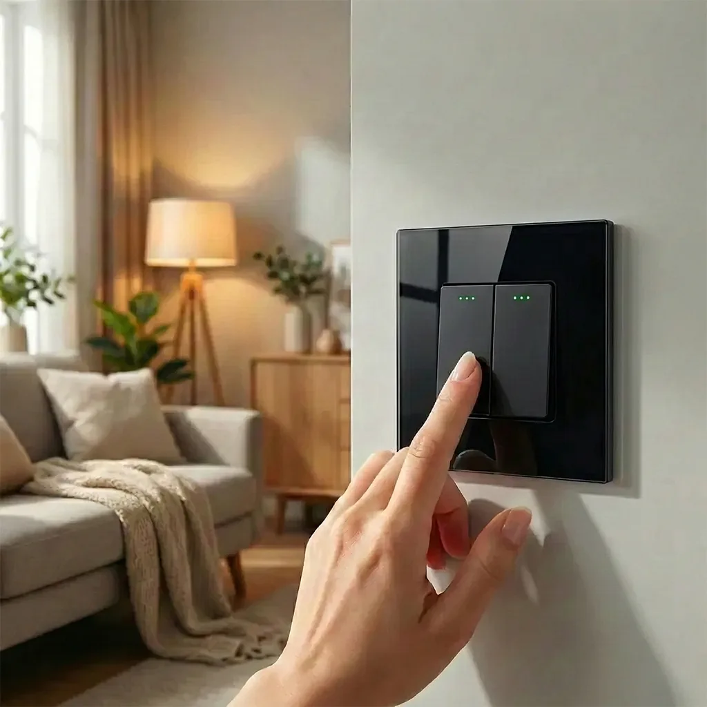 Tento dvojpólový vypínač umožňuje ovládať dva svetelné okruhy z troch miest. Predstavuje modernú náhradu za klasické plastové vypínače. Hlavnou prednosťou je predný panel z bezpečnostného skla, ktorý okrem estetickej funkcie prináša aj vysokú odolnosť voči mechanickému opotrebeniu a UV žiareniu, čo eliminuje degradáciu farieb.