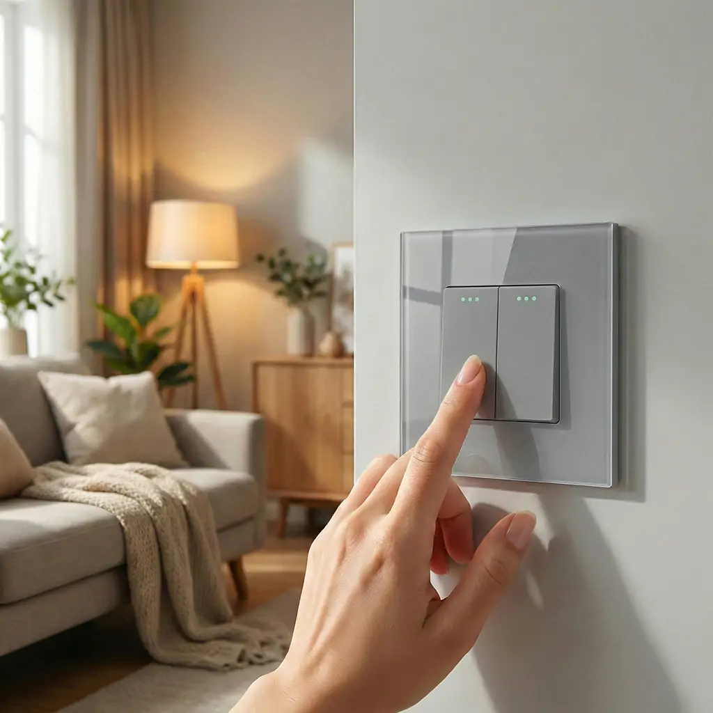 Tento dvojpólový vypínač, ktorý umožňuje ovládať dva svetelné okruhy z jedného miesta, predstavuje modernú náhradu za klasické plastové vypínače. Hlavnou prednosťou je predný panel z bezpečnostného skla, ktorý okrem estetickej funkcie prináša aj vysokú odolnosť voči mechanickému opotrebeniu a UV žiareniu, čo eliminuje degradáciu farieb.